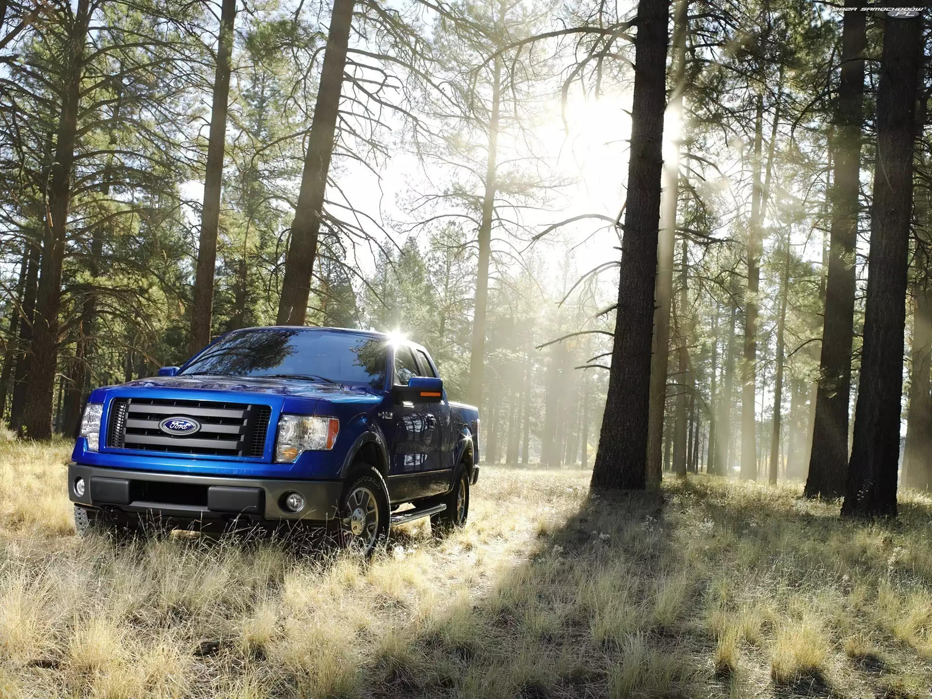 Samochód: Ranger, Trawa, Las, Drzewa, Niebieski, Ford